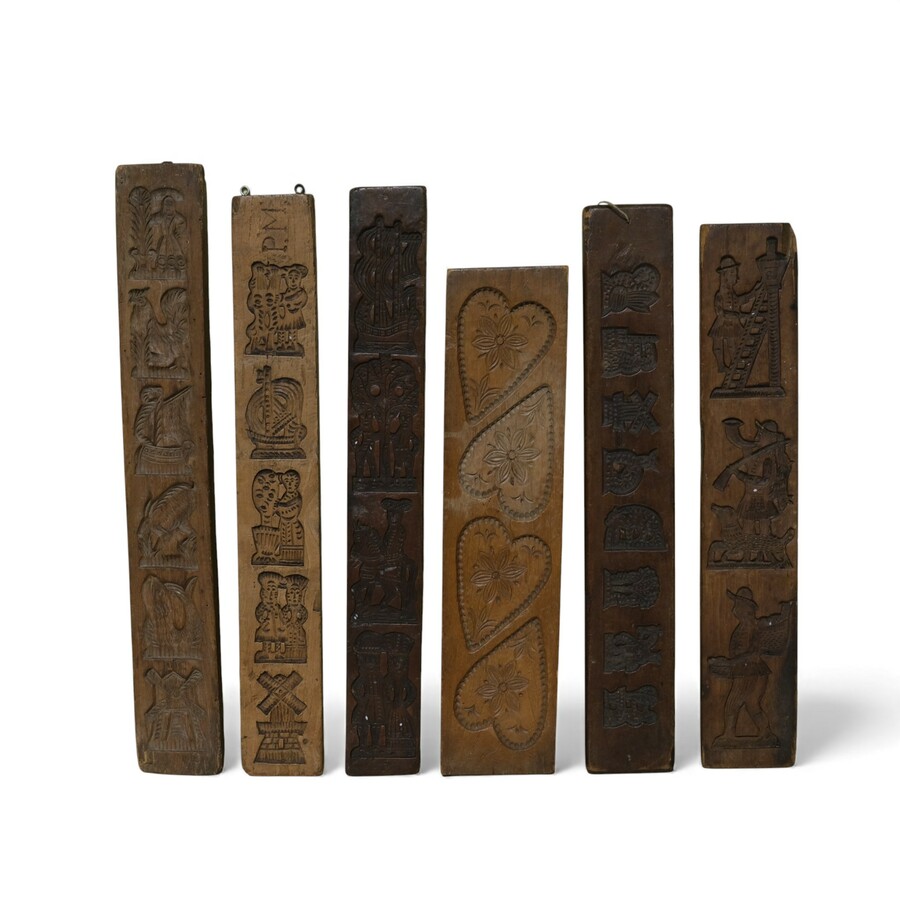 Lot koekplanken met onder andere een voorstelling van harten, molens, boten en diverse personen en figuren. Één van de planken is op de voorkant gesigneerd met PM.