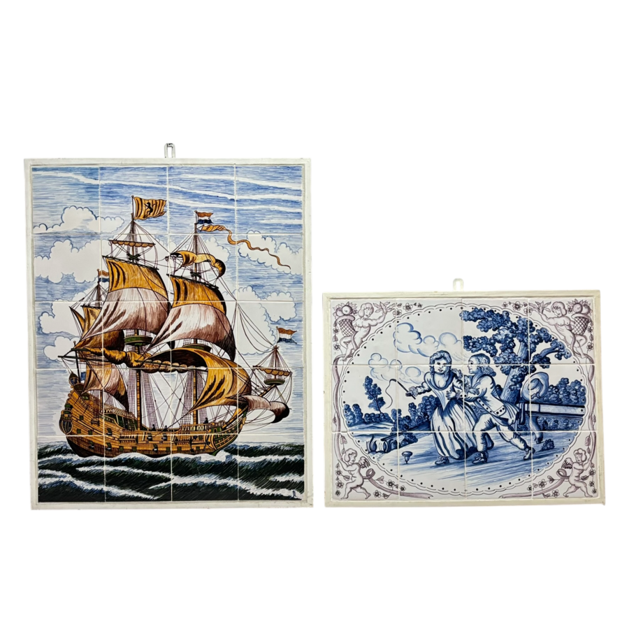Twee tegeltableaus, heer en dame en Hollandse driemaster.