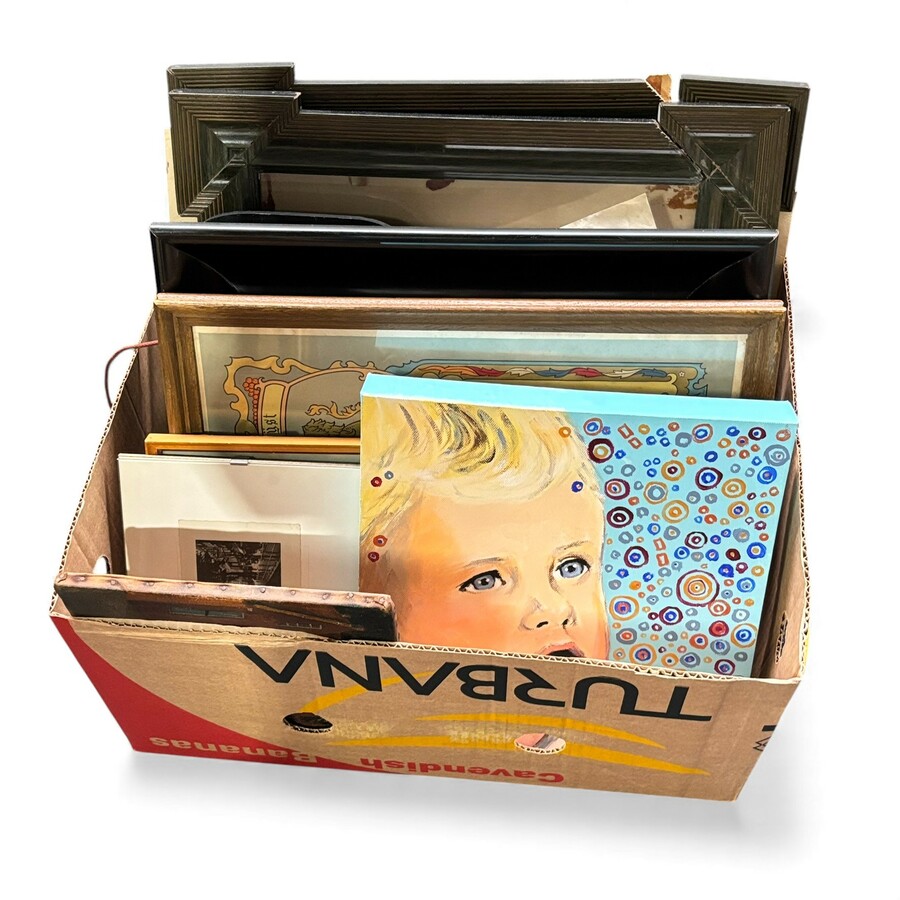 Doos met diverse kunstwerken. Bestaande uit etsen, tekeningen foto etc. Meeste is gelijst.
