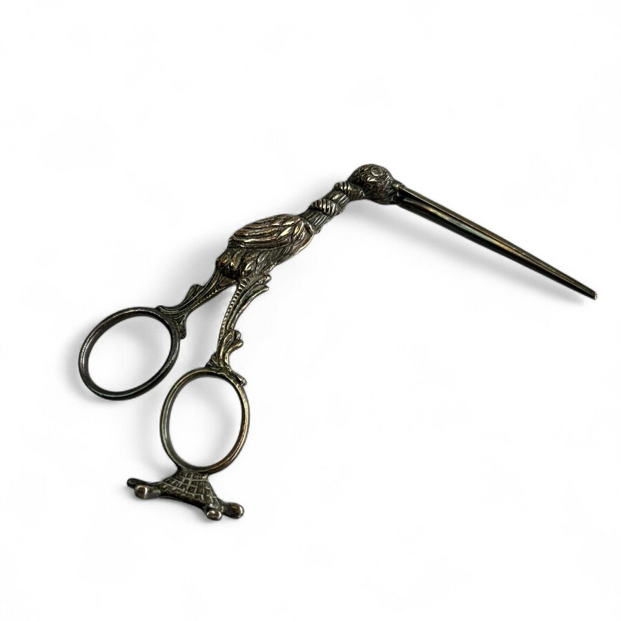 Een 20e eeuwse tweede gehalte (835/1000) Nederlands zilveren luierschaar in de vorm van een ooievaar, staand op schildpad, met kindje aan de binnenzijde.