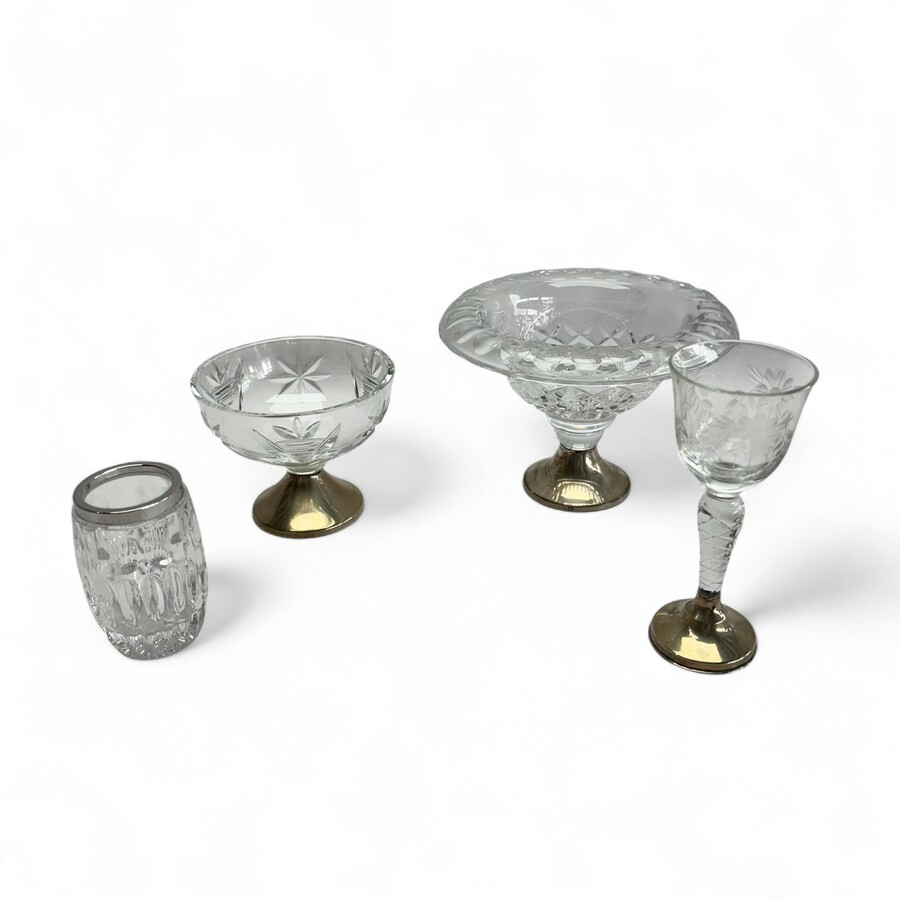 Lot divers kristal, waaronder een lepelvaasje en bonbonniere. Drie op tweede gehalte (835/1000) zilveren voet, lepelvaasje met derde gehalte (800/1000) zilveren rand.