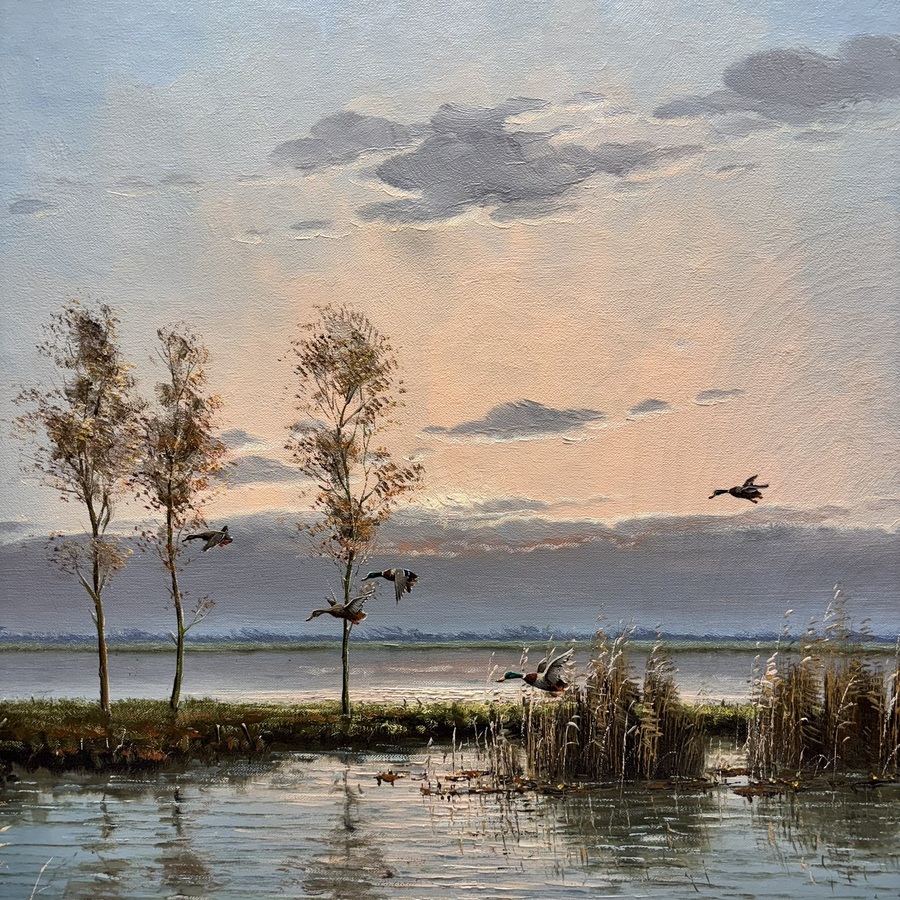 Schilderij, olieverf op doek. Opvliegende eenden bij avondrood. Rechtsonder gesigneerd ‘G.v.d.Velde’ = Gien Brouwer (Waddinxveen, 1944).