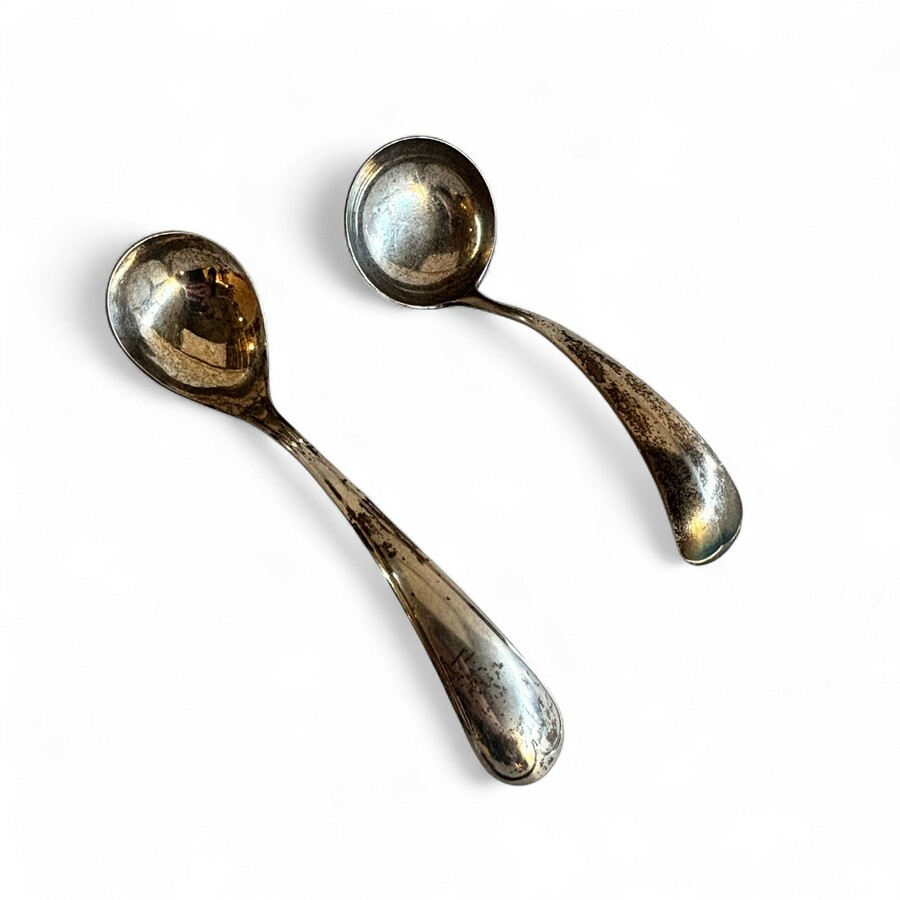 Lot van twee tweede gehalte (835/1000) Nederlands zilveren lepels: een juslepel, Haags Lof, gemerkt Voorschoten, jaarletter P (1925), gegraveerd met initialen ‘AJK’ en datering ‘1-12-25’. Met da...