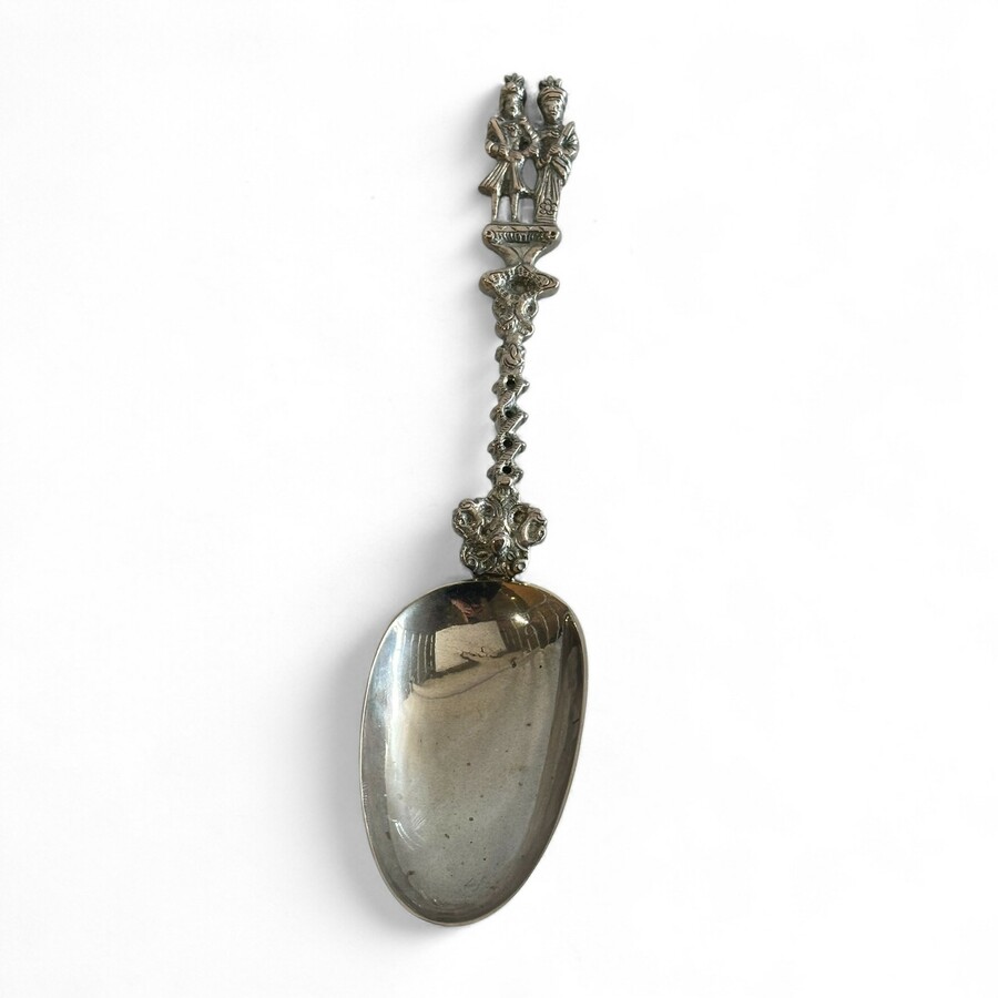 Een 19e of 20e eeuwse tweede gehalte (835/1000) zilveren geboortelepel, getorste steel, bekroond met Vorstelijk paar. Met inscriptie op de bak ‘1756’, verder ongekeurd.