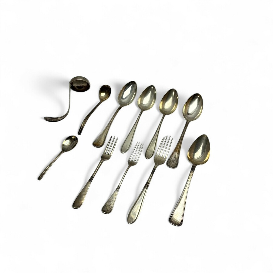 Een lot met 2e en 3e gehalte (800/1000 en 835/1000) zilveren schepwerk, bestaande uit lepels, vorken, roomlepels, jamlepel etc. Hierbij een 18e eeuwse vork.