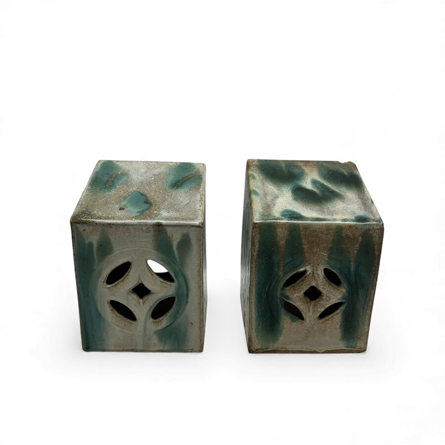 Twee Chinees Shiwan aardewerken hoofd of opiumkussens. Met opengewerkt motief en in een groen/wit glazuur. 19e eeuws.