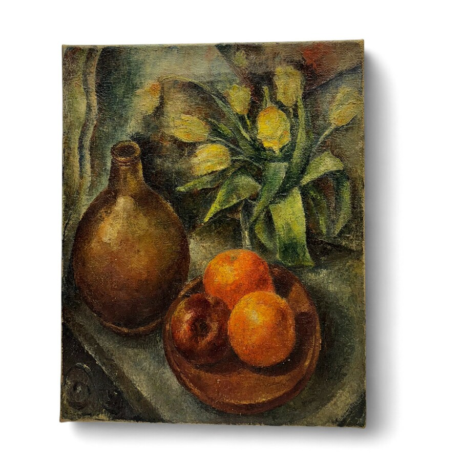 Schilderij, olieverf op doek. Tafel met kruik, fruit en bloemen. Rechtsonder gesigneerd 'Cuun v/d Steene' = Cunegondus Theodorus Emile van den Steene (Rotterdam 1909 - Baarn 1971).