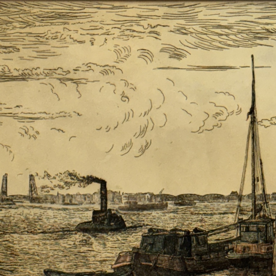 Grote gedeeltelijk ingekleurde ets op papier, voorstelling van de haven van Rotterdam. Linksonder titel 'Rotterdam havengezicht', rechtsonder gesigneerd Wim Beeke.