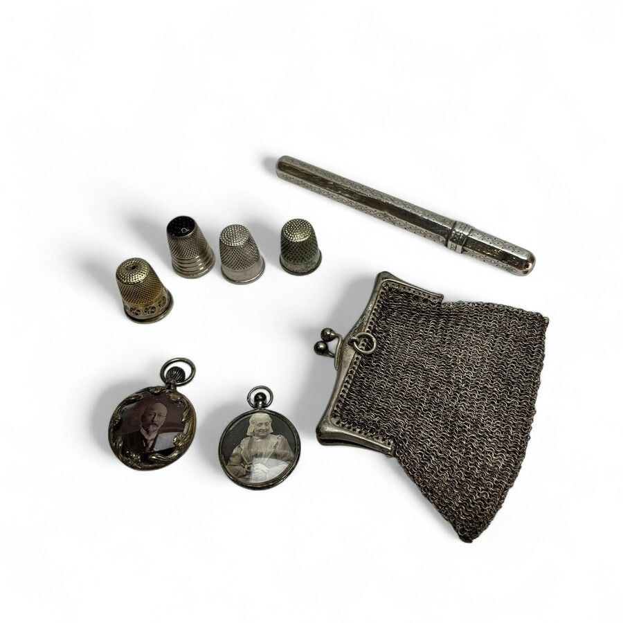 Lot divers zilver: een derde gehalte (800/1000) maliënkolderbeursje, een antieke 19e eeuwse tweede gehalte (835/1000) naaldenkoker, achtkantig model, rondom gegraveerd, twee medaillons, en enkel...