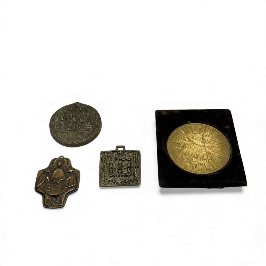 Lot van vier bronzen penningen, grootste, met diverse voorstellngen, twee religeus.