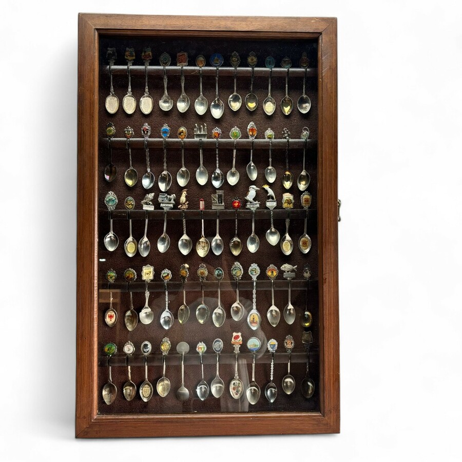 Een 20e eeuwse hangvitrine, gevuld met zestig verzilverde lepeltje, thema Australië