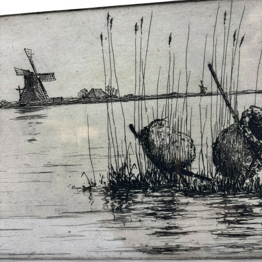 Ets op papier, voorstelling van twee eendenkorven en molen, titel ‘Yn ‘t Wetterlan’. Rechtsonder gesigneerd Johan Hemkes (Schalsum 1894 - Bilthoven 1988), gedateerd 1934.