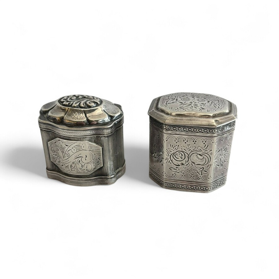 Lot van twee antieke 19e eeuwse tweede gehalte (835/1000) zilveren lodereindoosjes, beide met gegraveerd decor. Eén met sponsje, stippelgravure ‘A. Zondervan’, gemerkt met meesterteken PC114 = P...