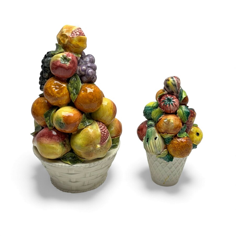 Lot van drie 20e eeuwse Italiaanse polychrome tafelstukken, in de vorm van manden, gevuld met fruit. Kleinste exemplaar gemerkt ‘Italy’.