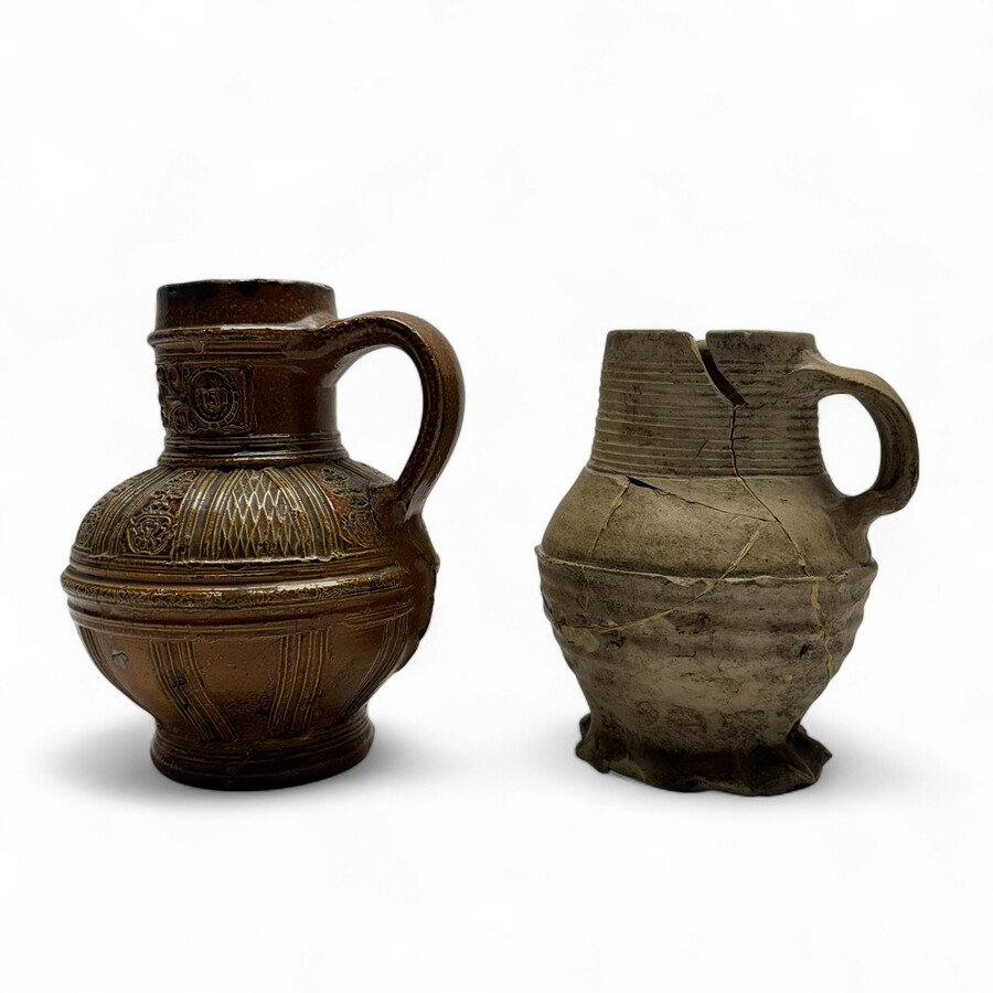 Twee steengoed kruiken: een bruingeglazuurde schenkkan met oor, ca. 1600 en een grijsgeglazuurde kruik met draairingen op de buik en hals, Siegburg, 15e eeuws.