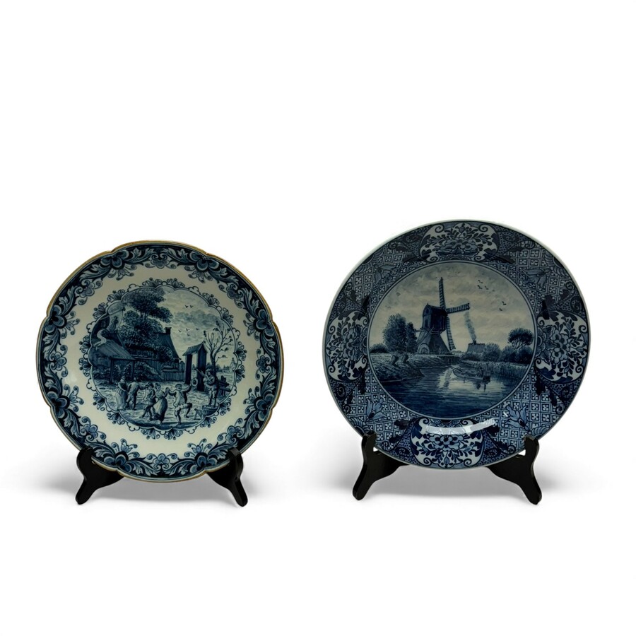 Lot van twee 20e eeuwse blauw-witte wandborden, Tichelaar Makkum. Eén met voorstelling van een viser bij een molen, één met voorstelling van een boerenfeest, in 17e eeuwse stijl. Beide gemerkt T...