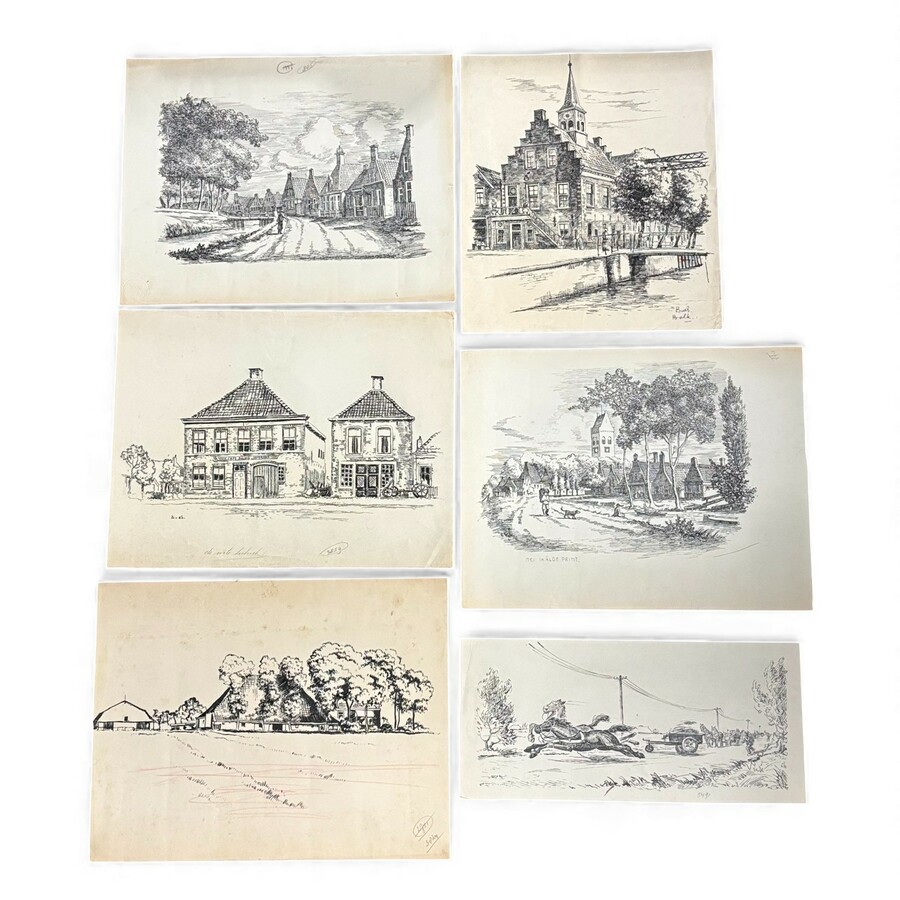 Lot diverse inkttekeningen op papier. Diverse titels en voorstellingen: 2x 'Raerd', 'Pleats, yn eigendom en bewenne troch de hear D.H. Schaap', kar met twee paarden die op hol slaan, Cafe met op...