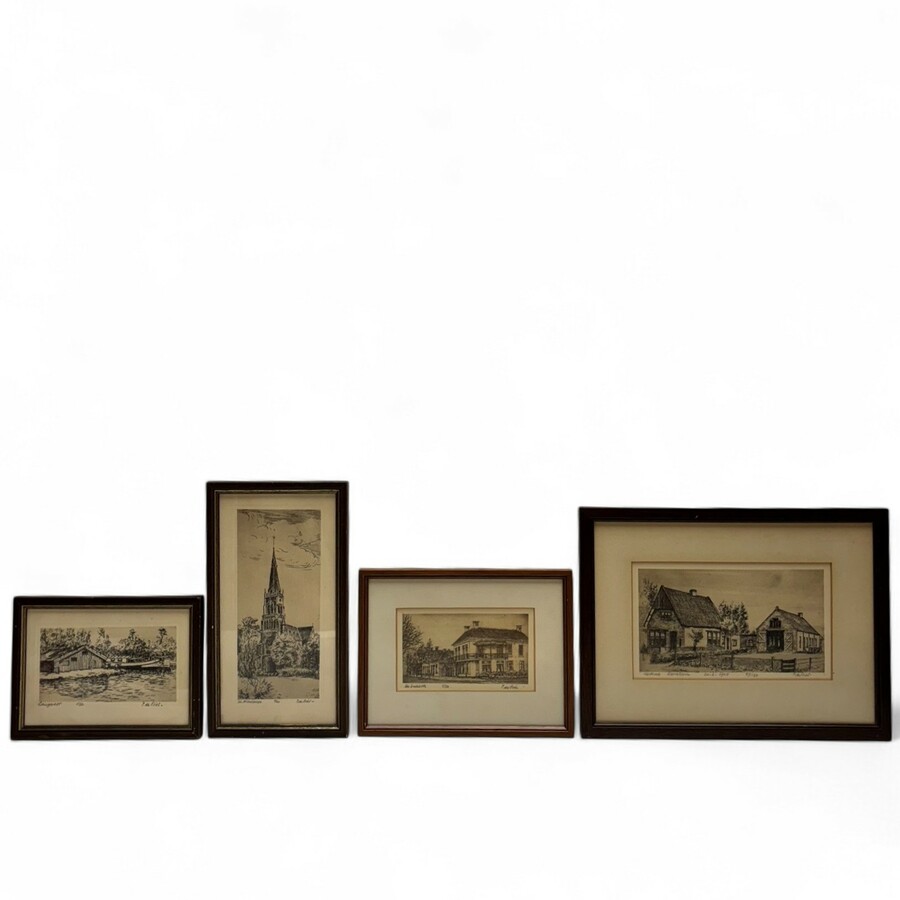 Lot van vier etsen, titels 'De Sweach', 'St. Nicolaasga', 'Langweer' en 'Hadewe Kornhorn '. Allen rechtsonder gesigneerd Piet de Vries (Koudum 1932 - Drachten 2003), 3x oplage 50, 1x oplage 150....