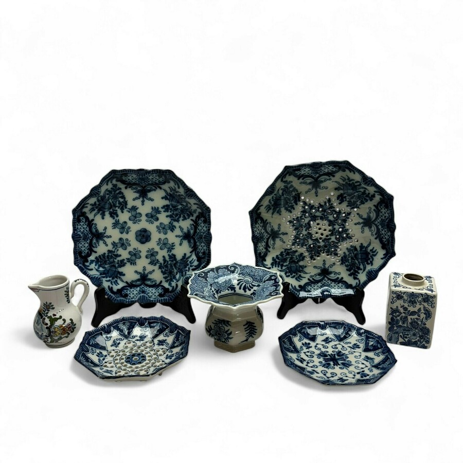 Een lot met Tichelaar, Makkum aardewerk. Bestaande uit twee fruittestjes, een theebus, een kwispedoor en een melkkannetje. Alles floraal beschilderd.