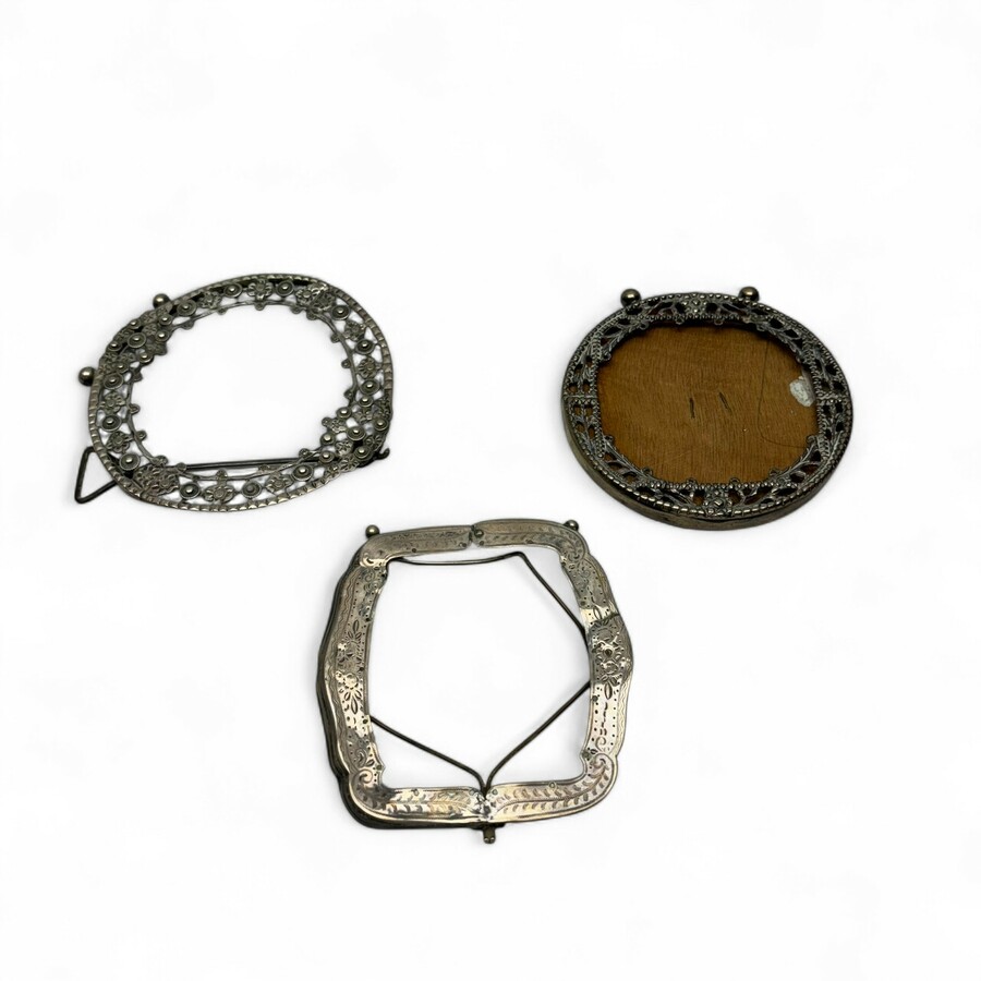 Drie tweede gehalte (835/1000) zilveren fotolijstjes, gemaakt van beursbeugeltjes. Diverse versieringen.