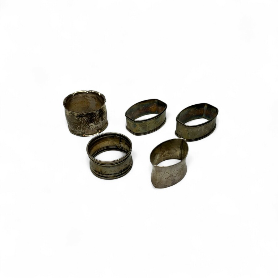 Vijf servetringen, waarvan vier van tweede gehalte (835/1000) zilver Diverse modellen.