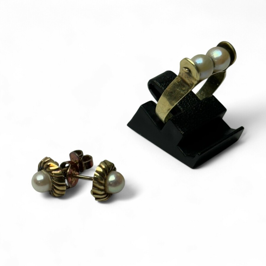 Een 20e eeuwse 14 karaats (585/1000) geelgouden damesring bezet met twee parels, met daarbij twee 14 karaats (585/1000) geelgouden oorknoppen, tevens bezet met parel
