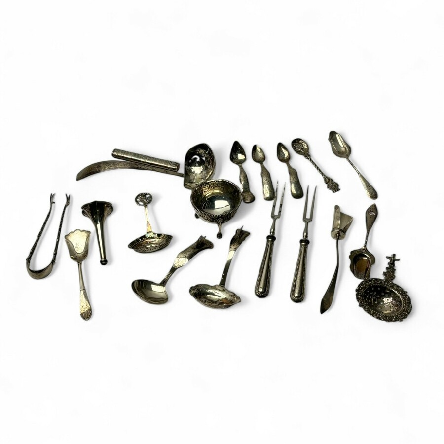 Lot divers tweede gehalte (835/1000) Nederlands zilveren schepwerk en diversen, waaronder een theezeefje op lekbakje, 19e eeuwse ajour gezaagde strooilepel, naaldenkoker, twee vorkjes met derde ...