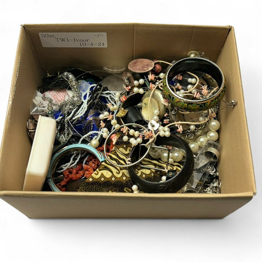 Doosje met diverse sieraden en curiosa, waaronder zilver