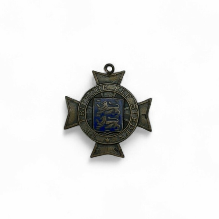 Een 20e eeuwse tweede gehalte (835/1000) zilveren medaille, Elfstedenkruisje. Aan de voorzijde geëmailleerd met het wapen van Friesland en de tekst 'De Friesche Elf Steden', de achterzijde met t...