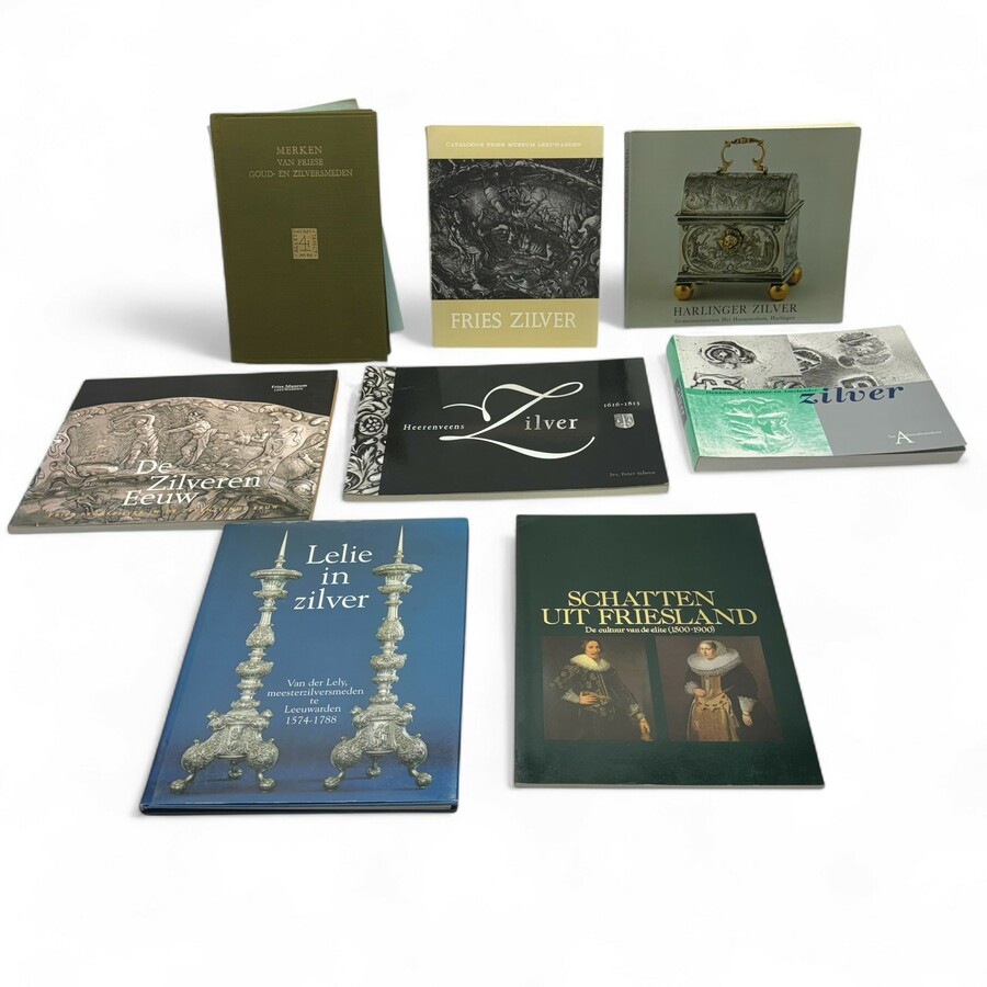 Lot diverse boeken over Fries zilver, o.a. tentoonstellingscatalogi, ‘Merken van Friese Goud- en Zilversmeden’ door Voet, Harlinger zilver, ‘Dokkumer, Kollumer en Amelander zilver’, Heerenveens ...