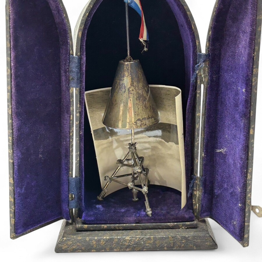 Een 20e eeuws zilveren miniatuur rifbaken, met inscriptie '15-3-1932 / 12-6-1936'. In originele foedraal, met daarbij een foto met opschrift 'Rifbaken zooals zeer veel geplaatst op kustriffen en...