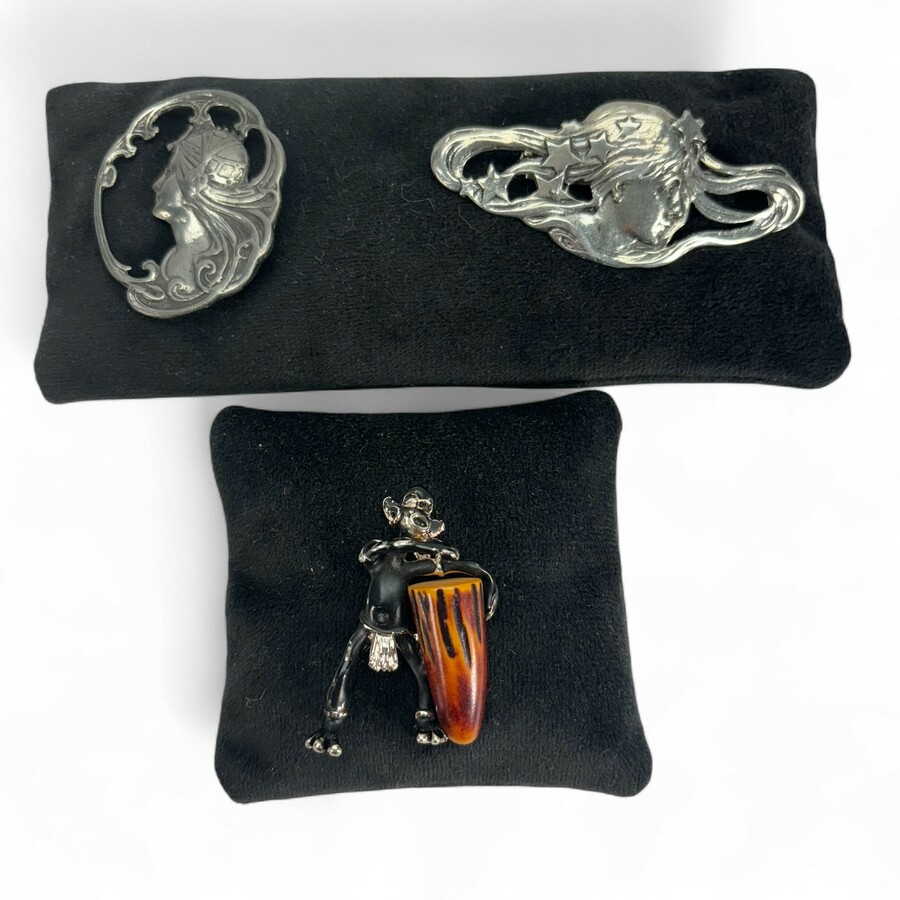 Twee BWG wit metalen broches, 5 en 7,5 cm lang. In Art Nouveau/ Jugendstil stijl. Naar Alphons Mucha.Hierbij een verchroomde, deels gepatineerde broche met bakeliet, 5 cm hoog. Voorstellende een...