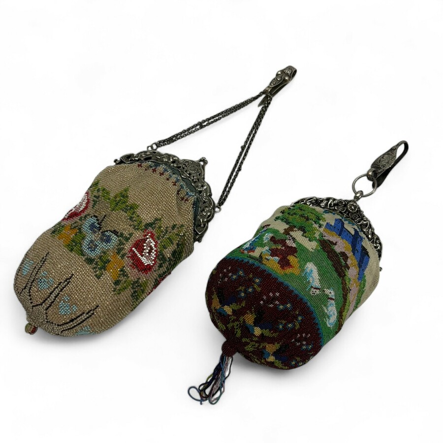 Twee tweede gehalte (835/1000) Nederlands zilveren tasbeugels aan kralentasjes, één opengewerkt