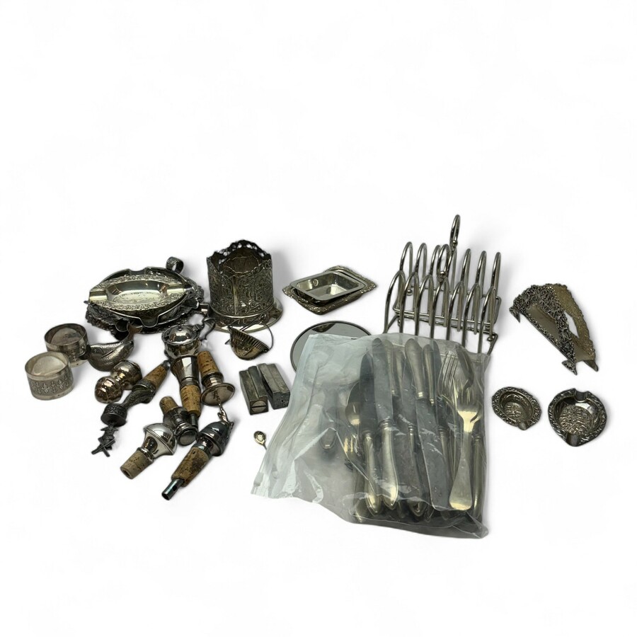 Lot met divers verzilverde artikelen, bestaande uit toastrekjes, tuitzeef, flessen stoppen, asbakken etc.