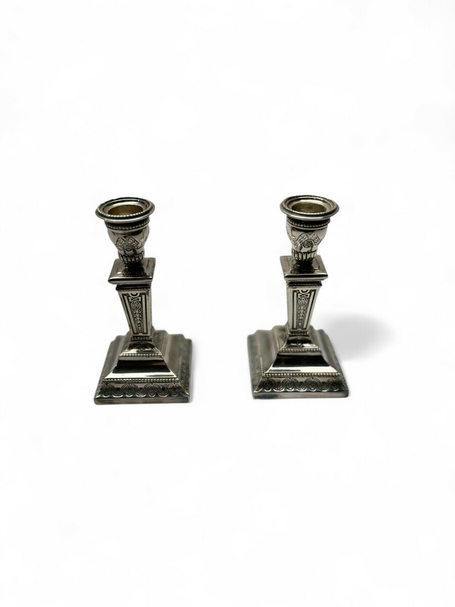 Een stel 20e eeuwse eerste gehalte (925/1000) zilveren kandelaars, vierkante voet, bovenrand met parelrand. Gemerkt ‘Sterling’ en ‘ZII’ importkeur.