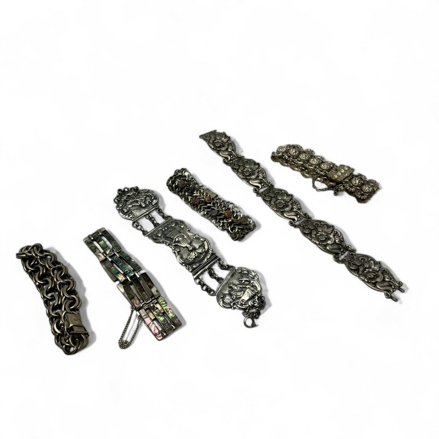 Lot van zes diverse eerste (925/1000) en tweede (925/1000) gehalte zilveren armbanden. Diverse voorstellingen en uit diverse landen, o.a. één gemaakt van een Bijbelslot, 1806 en een Mexicaanse a...