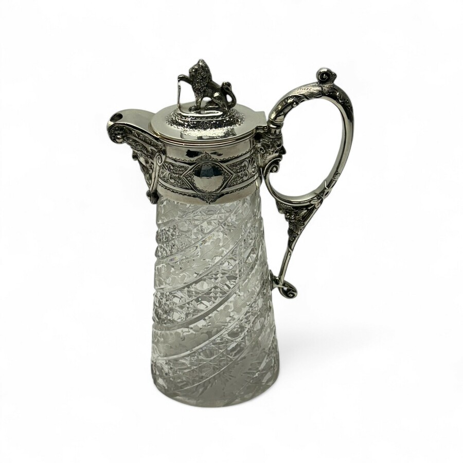 Een gegraveerd en geslepen kristallen wijnkan met verzilverde greep en schentuit versierd met druivenranken en bacchuskoppen. De deksel bekroond met een leeuw met wapenschild. Vroeg 20e eeuws.