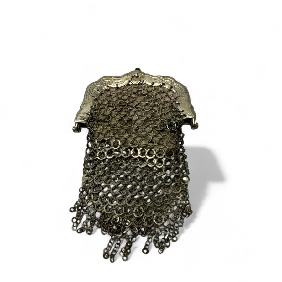 Een antiek 19e eeuws tweede gehalte (835/1000) zilveren maliënkolderbeursje, met gegraveerde en gecontourneerde beugelrand en binnenbeugeltje.