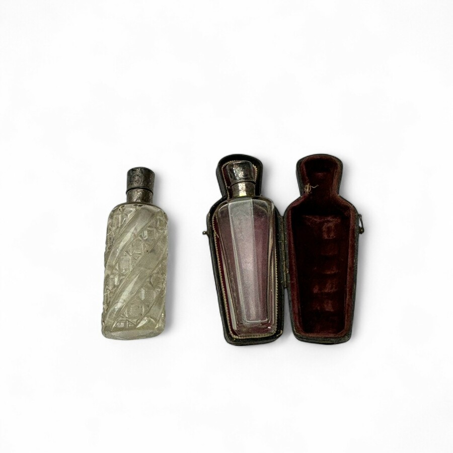Lot van twee antieke 19e eeuwse kristallen parfumflacons met tweede gehalte (835/1000) zilveren hals en dop, één in foedraal.