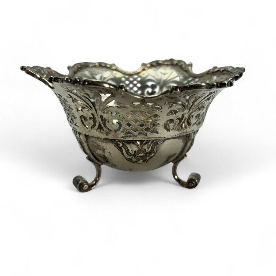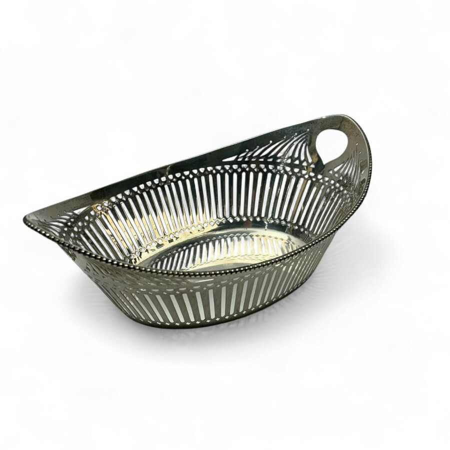 Een tweede gehalte (835/1000) zilveren schuitvormige mand met opengewerkte randen.