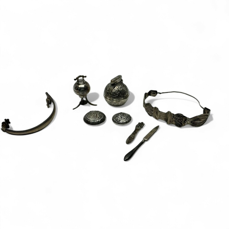 Lot met diverse 1 en tweede gehalte (925/1000 en 835/1000) zilveren en verzilverde voorwerpen. Bestaande uit beugels voor schotels, aansteker, twee dekseldoosjes, Chinese strooier.