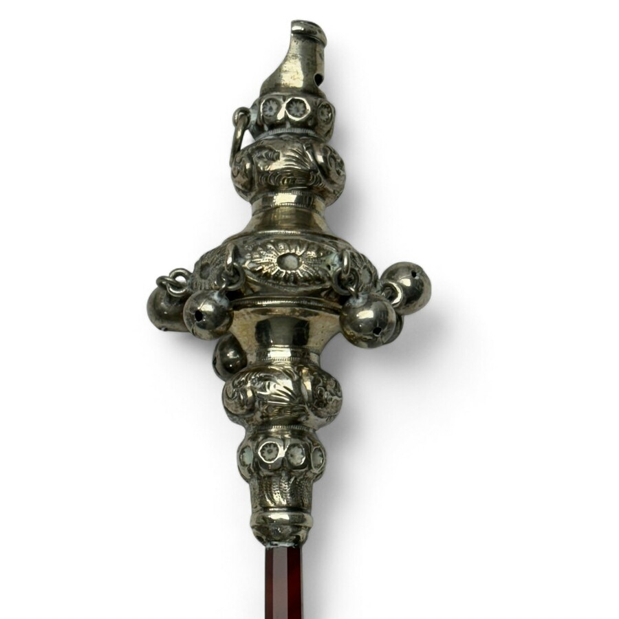 Een antieke 19e eeuwse eerste gehalte (925/1000) zilveren rammelaar met fluitje en agaten steel. Gemerkt met lopende leeuw op oogje.