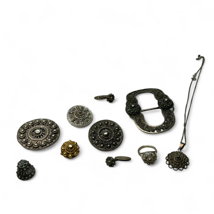 Lot diverse zilveren Zeeuwse knop sieraden, onder andere een gesp, meerdere broches en een vingerhoed.