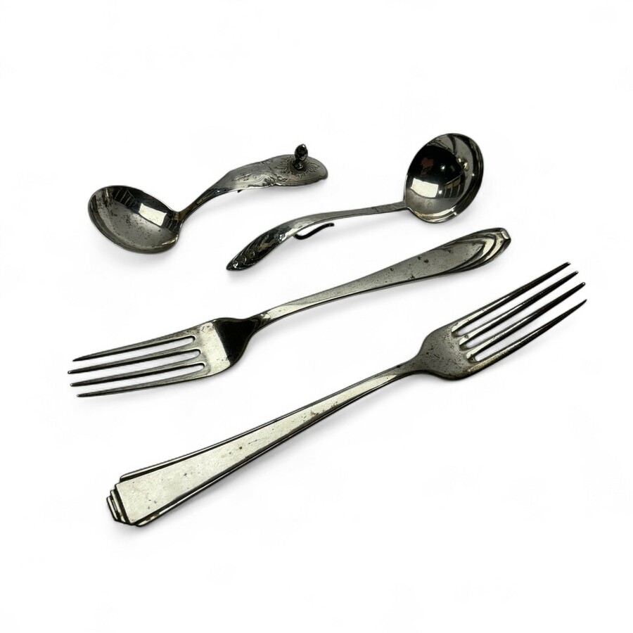Lot divers tweede gehalte (835/1000) zilveren schepwerk: twee zilveren jaren ’30 vorken en twee roomlepels