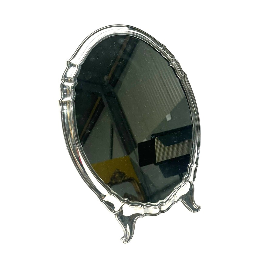 Een Duits ovale spiegel in een 3e gehalte (800/1000) zilveren lijst op twee voetjes. Met een houten achterzijde. Met een Hollands importkeur.