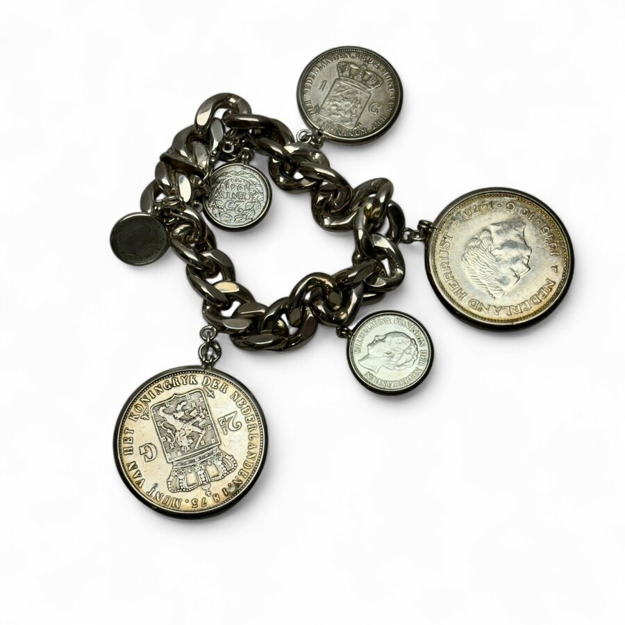 Een 20e eeuwse eerste gehalte (925/1000) zilveren armband, met daaraan diverse munten: Rijksdaalder 1873, 1/2 Gulden 1928, 10 Gulden munt 1970, Gulden 1892, 25 cent 1941 en 10 cent 1928