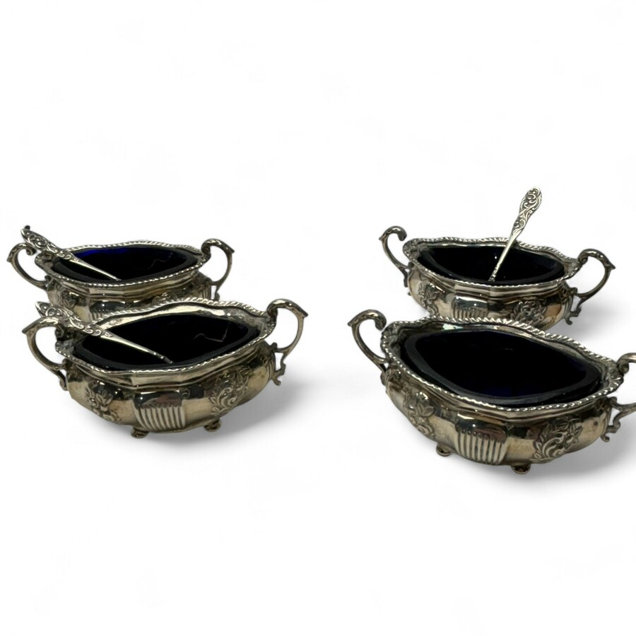 Lot van vier 20e eeuwse eerste gehalte (925/1000) Engels zilveren zoutvaatjes, met blauw glazen binnenbakjes. Met daarbij drie met een eerste gehalte (925/1000) zilveren lepeltje.