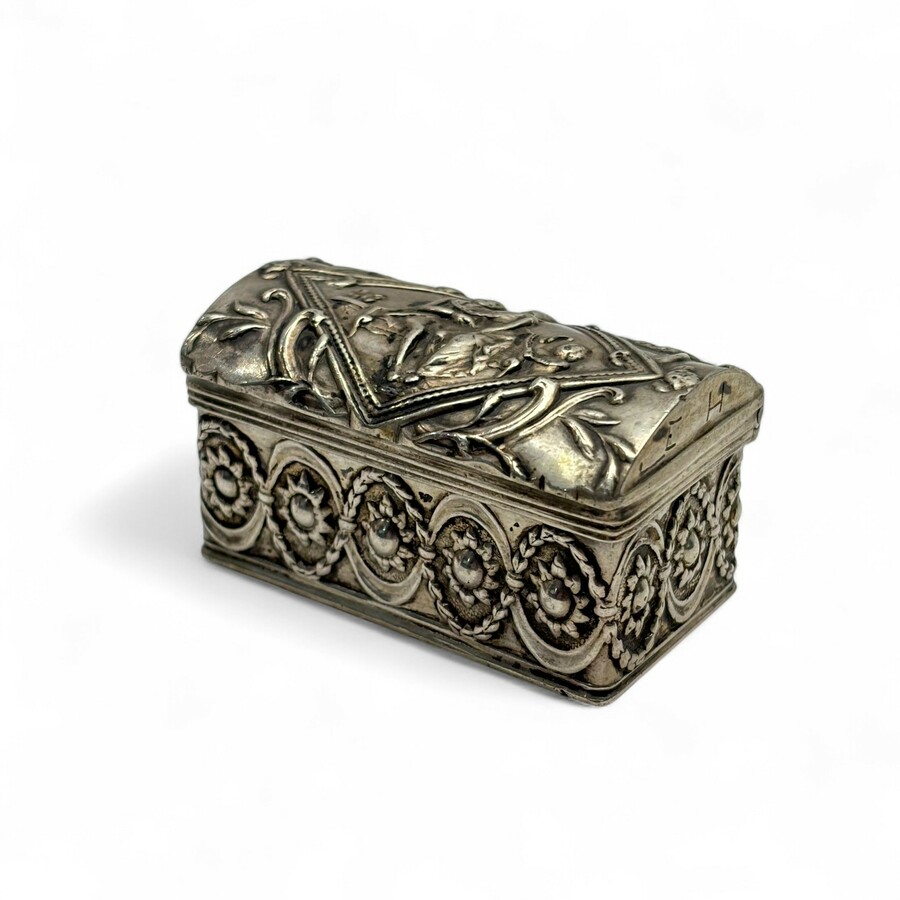 Een 19e eeuws tweede gehalte (835/1000) zilveren knottekistje. Vierkant model met bolvormige deksel en gedreven decor van liefdespaar op de deksel