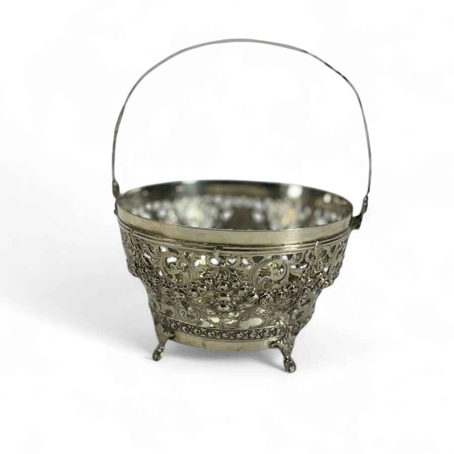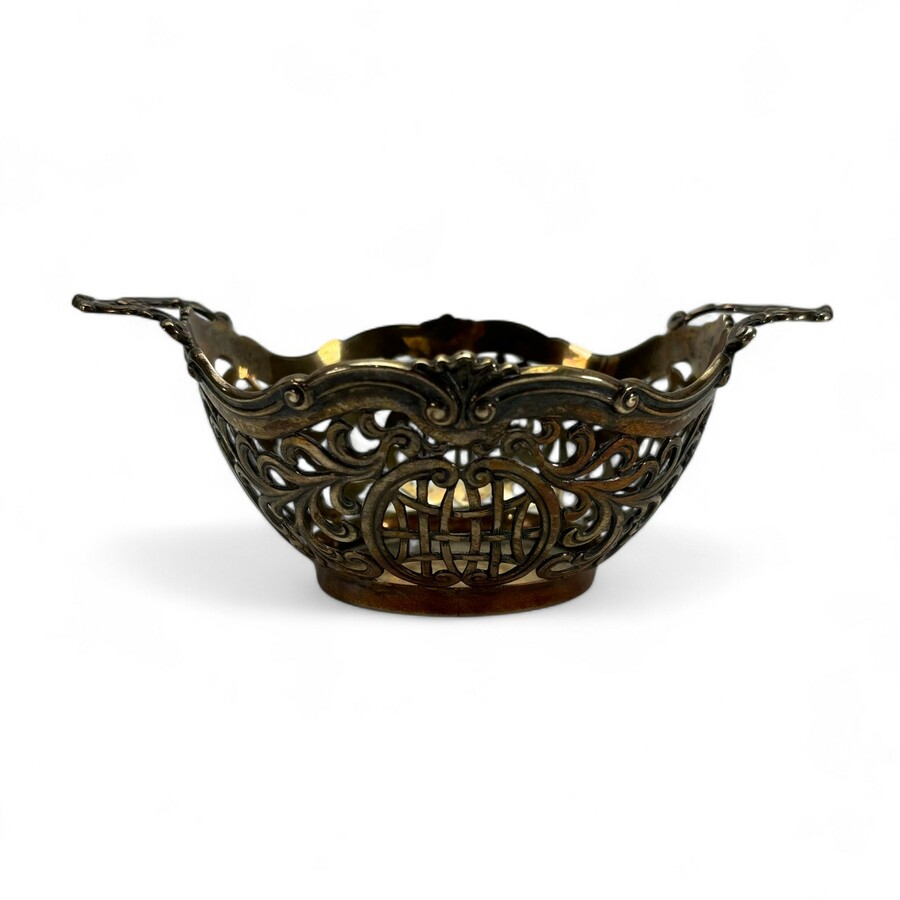 Een 20e eeuws tweede gehalte (835/1000) zilveren bonbonmandje, ajour gezaagd en met twee grepen. Aan de onderzijde gekeurd met lopende leeuw en meesterteken HN* = H. Nieuwold, Groningen/Zeist, w...