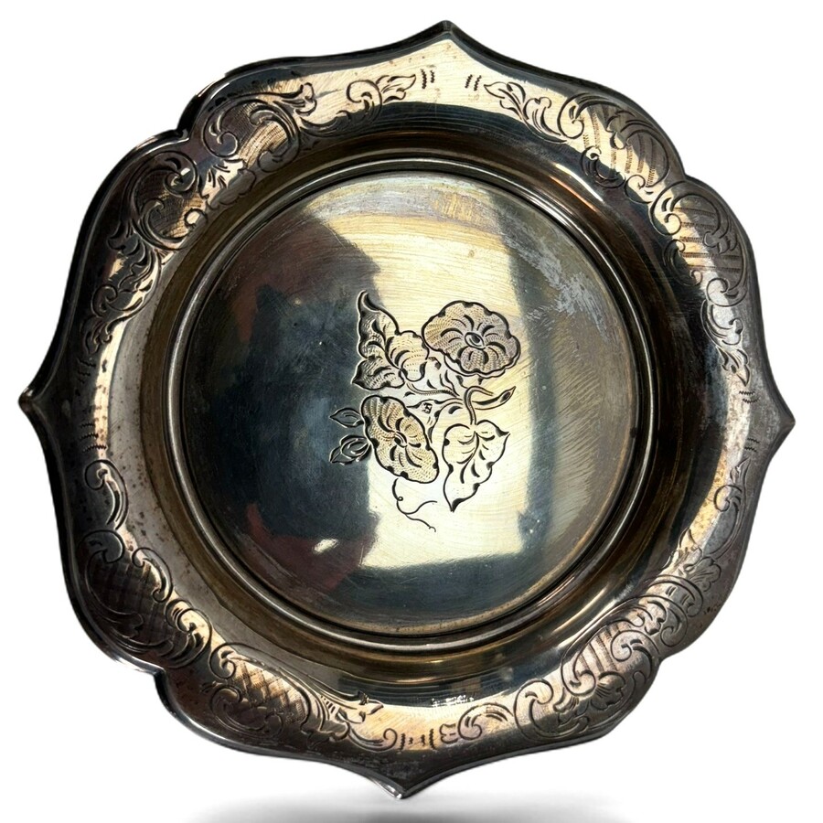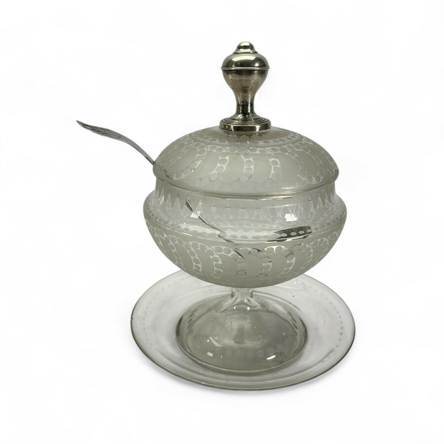 Glazen punchbowl met 2e gehalte zilveren dop, op bijbehorende onderschotel, beide met geetst decor, daarbij: 2e gehalte zilveren serveerlepel, onduidelijk meesterteken, jaarletter 1924